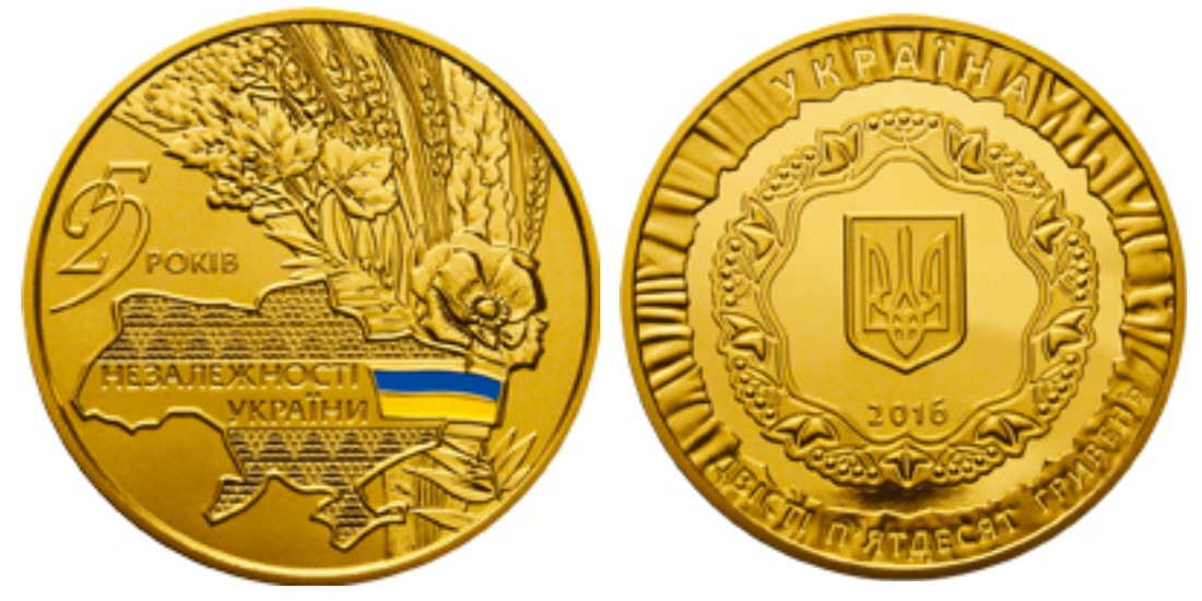 Золотая монета 25 лет независимости Украины номиналом 250 грн нбу
