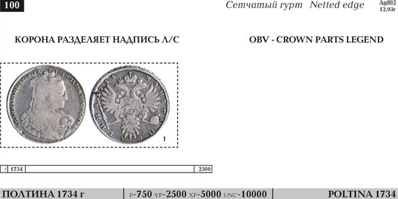 Например, по предыдущим редакциям пользователям приложения-ценника известен довольно редкий тип 100 – серебряная полтина 1734 г. с сетчатым гуртом и с портретом Анны на лицевой стороне, где корона разделяет надпись между словами IМПЕРАТРИЦА и IСАМОДЕРЖ. В приложении для данного типа выделена единственная разновидность № 1 (Кон.100/1), средняя цена которой для состояния VF составляет 2 500 долларов США.