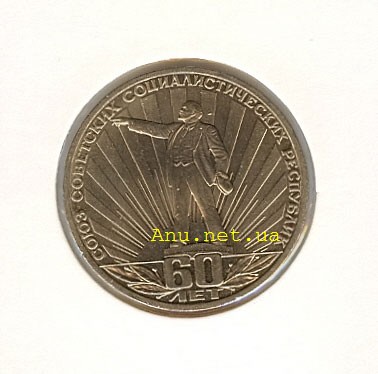 В центре на фоне лучей солнца рельефное изображение В.И.Ленина. Под ним на фоне лавровых ветвей надпись "60 ЛЕТ". От левой до правой лавровой ветви вдоль внешнего ободка монеты по окружности расположена надпись "СОЮЗ СОВЕТСКИХ СОЦИАЛИСТИЧЕСКИХ РЕСПУБЛИК".