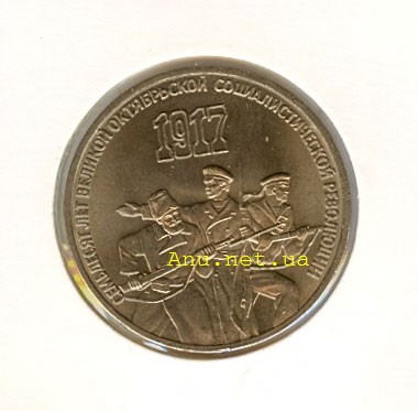 В центре группа революционных гвардейцев - крестьянин, рабочий и солдат.Над ними дата "1917". Вдоль внешнего ободка монеты полукругом расположена надпись "СЕМЬДЕСЯТ ЛЕТ ВЕЛИКОЙ ОКТЯБРЬСКОЙ СОЦИАЛИСТИЧЕСКОЙ РЕВОЛЮЦИИ".