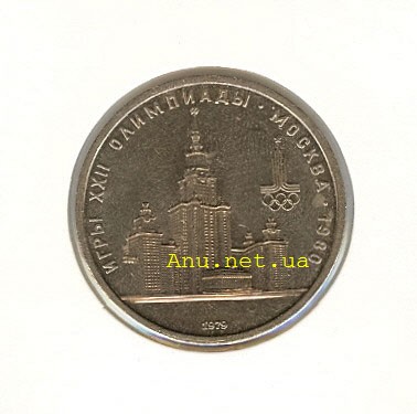 В середине фасад главного здания МГУ имени М.В.Ломоносова на Ленинских (теперь Воробьевых) горах, под ним - дата чеканки монеты "1979". Справа вверху эмблема Олимпиады-80. С внутренней стороны вдоль внешнего ободка монеты расположена надпись: "ИГРЫ XXII ОЛИМПИАДЫ. МОСКВА. 1980".