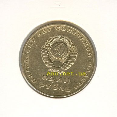 Тип II. В средней части поля по центру герб СССР. Под ним номинал “ОДИН РУБЛЬ”, написанный словами в две горизонтальные строки. От первой до последней буквы слова “РУБЛЬ” по окружности, примыкающей к внешнему контуру монеты, надпись “ПЯТЬДЕСЯТ ЛЕТ СОВЕТСКОЙ ВЛАСТИ”.