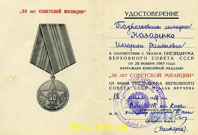 | Удостоверение к медали "50 лет Советской Милиции" |