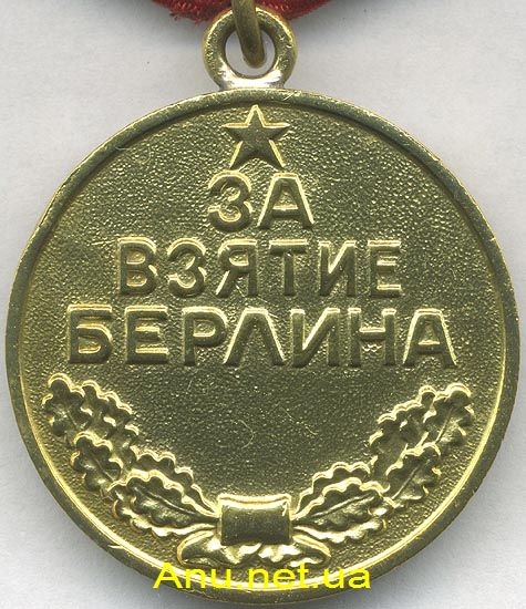 Медаль “За взятие Берлина” изготовляется из латуни и имеет форму правильного круга диаметром 32 мм.