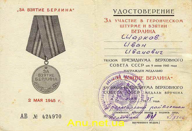 Указом Президиума Верховного Совета СССР от 5 февраля 1951 года установлено, что медаль “За взятие Берлина” и удостоверение к ней в случае смерти награжденного оставляются в его семье для хранения как память. До появления данного Указа сама медаль и удостоверение к ней после смерти награжденного возвращались государству.