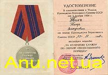 - за активное участие в охране общественного порядка и проявленные при этом храбрость и самоотверженность, активную борьбу с хулиганством, пьянством, хищением социалистической и личной собственности граждан, с нарушениями правил советской торговли, спекуляцией, самогоноварением и другими правонарушениями, приносящими вред обществу.