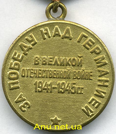 На оборотной стороне медали надписи: по окружности – “ЗА ПОБЕДУ НАД ГЕРМАНИЕЙ”, в центре – “В ВЕЛИКОЙ ОТЕЧЕСТВЕННОЙ ВОЙНЕ 1941-1945 ГГ.”, в нижней части - пятиконечная звездочка.