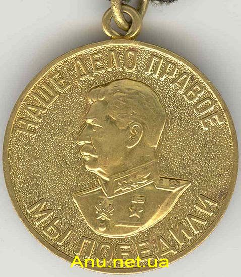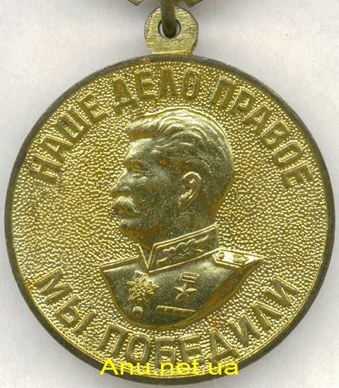 На лицевой стороне медали профильное погрудное изображение Сталина И.В. в форме Маршала Советского Союза, повернутое влево. В верхней части медали по окружности надпись “НАШЕ ДЕЛО ПРАВОЕ”, в нижней части по окружности надпись “МЫ ПОБЕДИЛИ”.