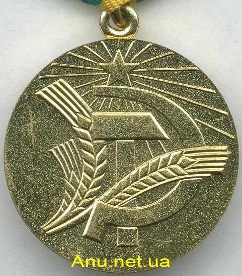 На оборотной стороне медали, в центре, расположено изображение серпа и молота с вплетенными пшеничными колосьями, в верхней части - пятиконечная звездочка с расходящимися лучами.