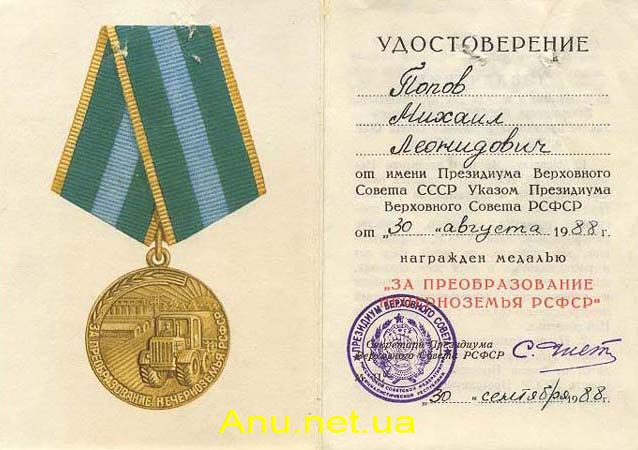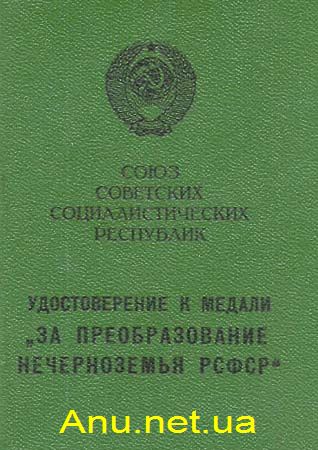 | Удостоверение к медали “За преобразование Нечерноземья РСФСР” |