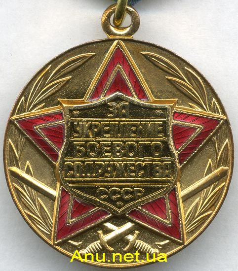 На лицевой стороне медали помещена пятиконечная звезда, концы которой покрыты красной эмалью. В центральной части звезды расположен щит с надписями на нем: “ЗА УКРЕПЛЕНИЕ БОЕВОГО СОДРУЖЕСТВА” и “СССР”. Слева и справа от звезды по окружности изображены лавровые ветви, в нижней части медали - два скрещенных меча.