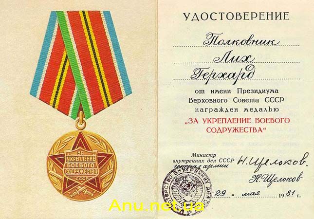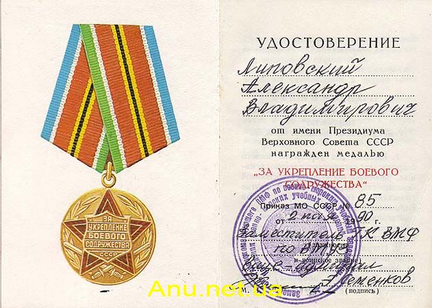 Медаль “За укрепление боевого содружества” - одна из самых редких послевоенных медалей СССР. Поскольку она вручалась в основном организаторам и участникам совместных учений армий стран Варшавского договора, круг награждённых был весьма ограничен.