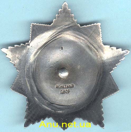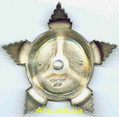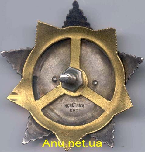 • Вариант 3. Три заклепки на реверсе. Центральный медальон крепится к серебряной звезде тремя заклепками. Две расположены несколько ниже нарезного штифта слева и справа от него (на 4 и 8 часов по циферблату), а третья - несколько выше штифта (на 12 часов). Расстояние от любой из заклепок до штифта приблизительно 7-9 мм. Встречаются разновидности с иным расположением заклепок. В клейме слово "МОНЕТНЫЙ" слегка изогнуто по дуге "горбиком". Минимальный известный номер ордена – 488, максимальный - 909.