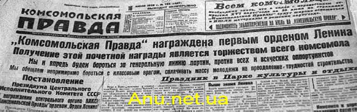 | Передовица о награждении газеты "Комсомольская правда" первым орденом Ленина |